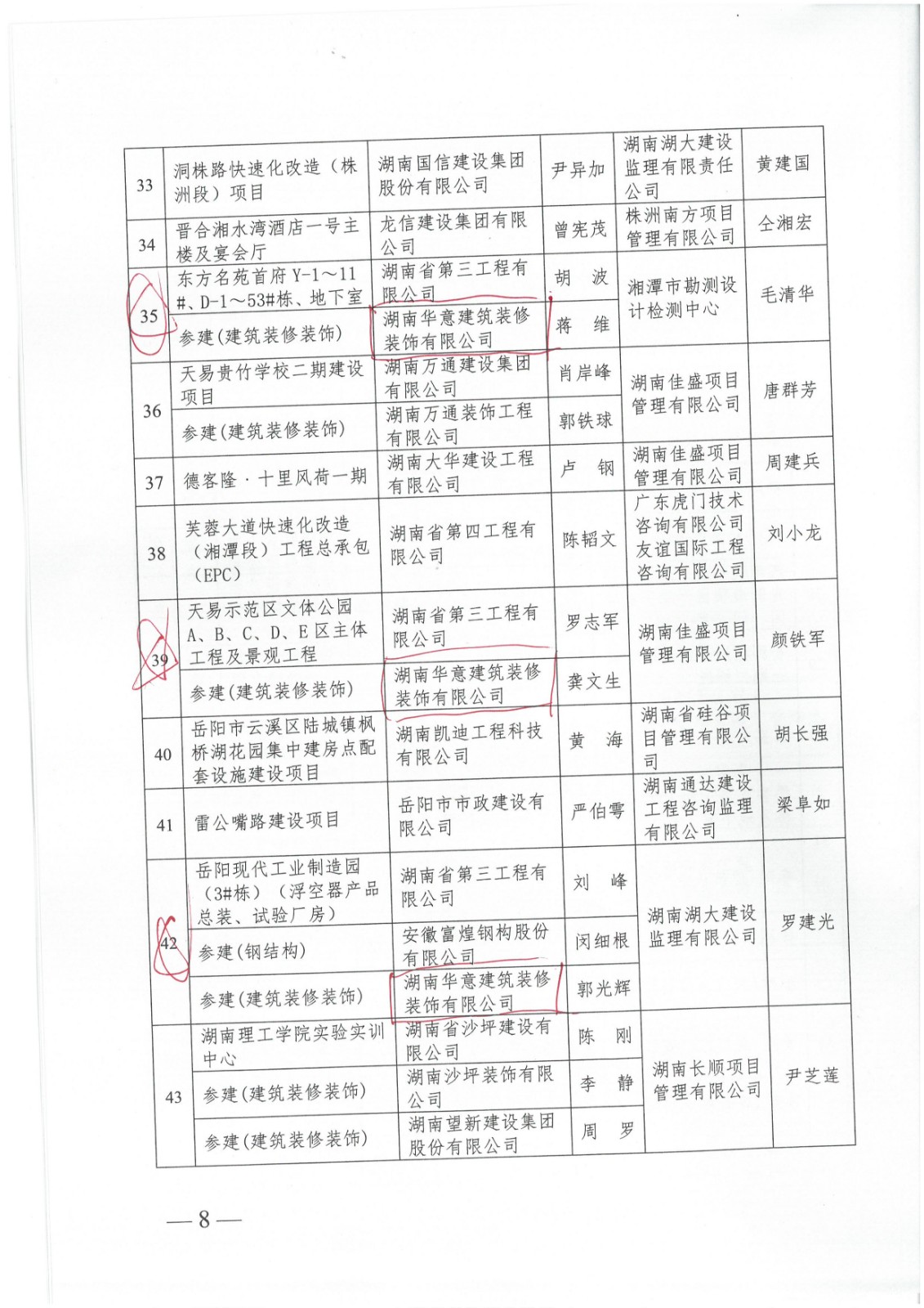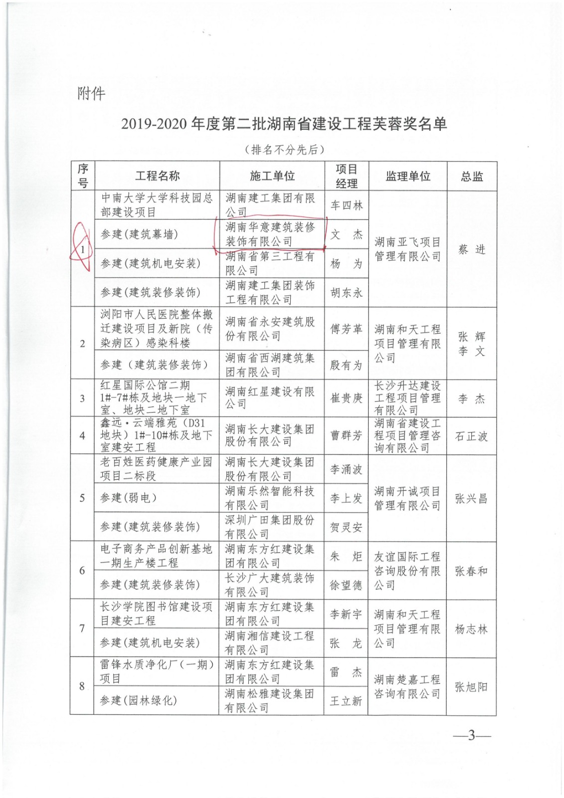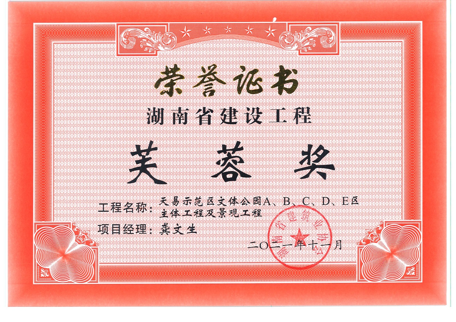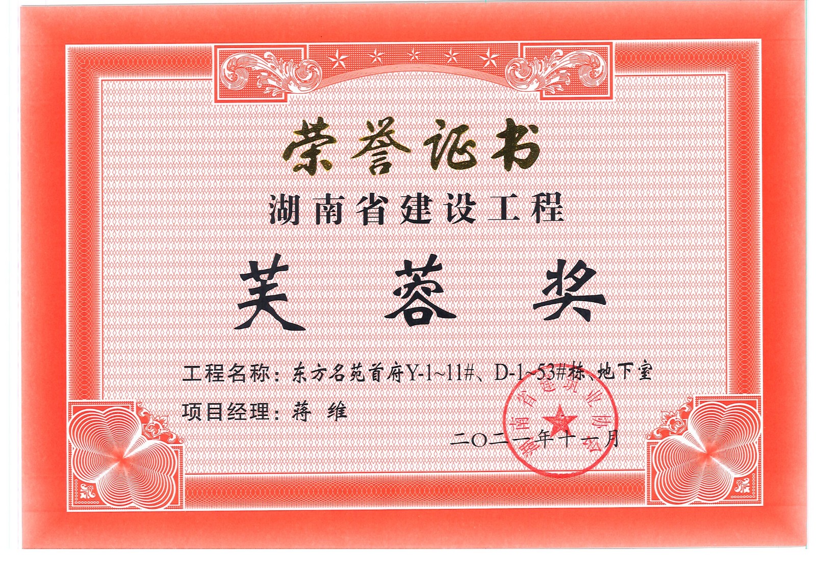 芙蓉獎---中南大學大學科技園總部建設項目、東方名苑首府Y-1~11#、D-1~53#棟、地下室、天易示范區(qū)文體公園ABCDE區(qū)主體工程及景觀工程、岳陽現(xiàn)代工業(yè)制造園(3#棟)(浮空器產(chǎn)品總裝、試驗廠房)