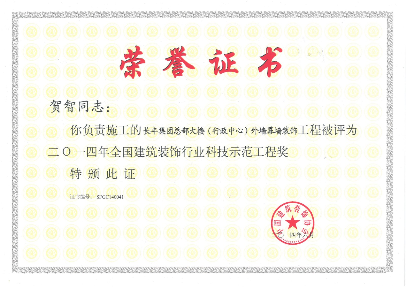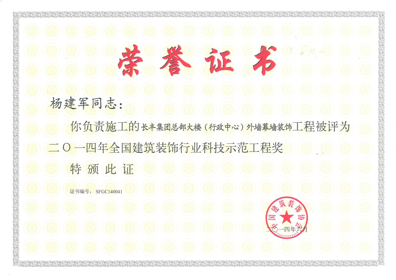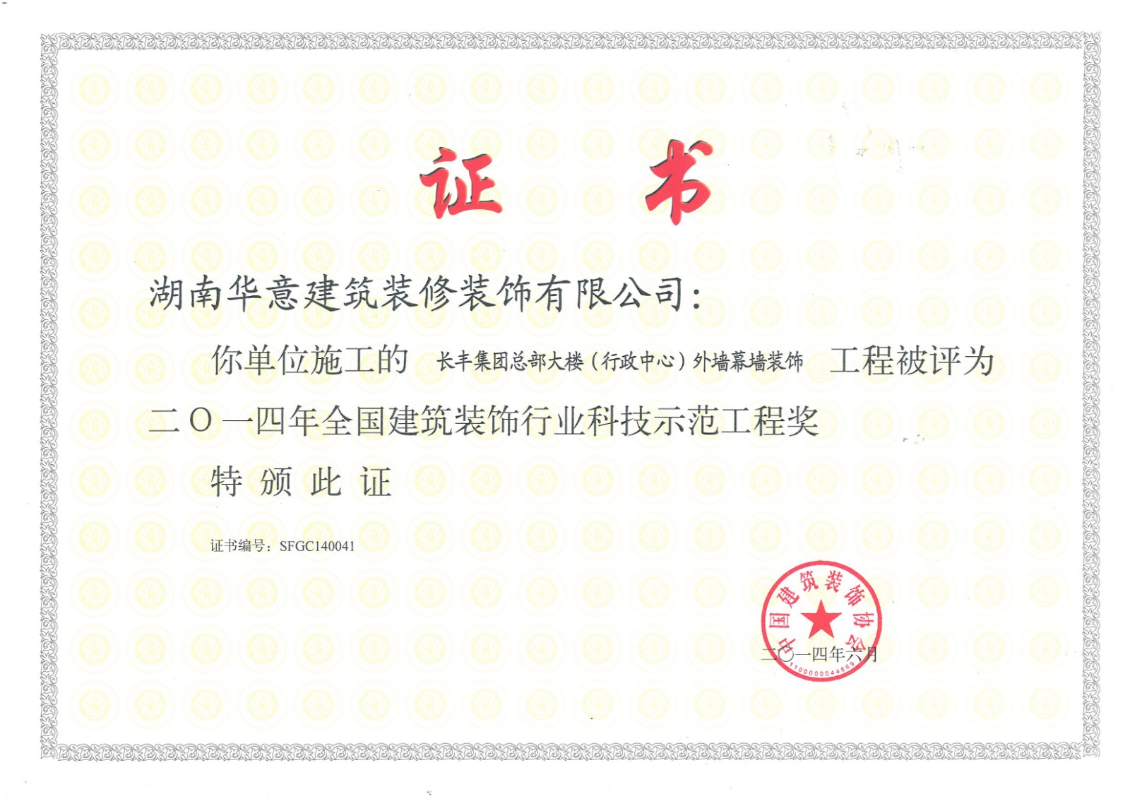 行業(yè)科技示范工程榮譽證書
