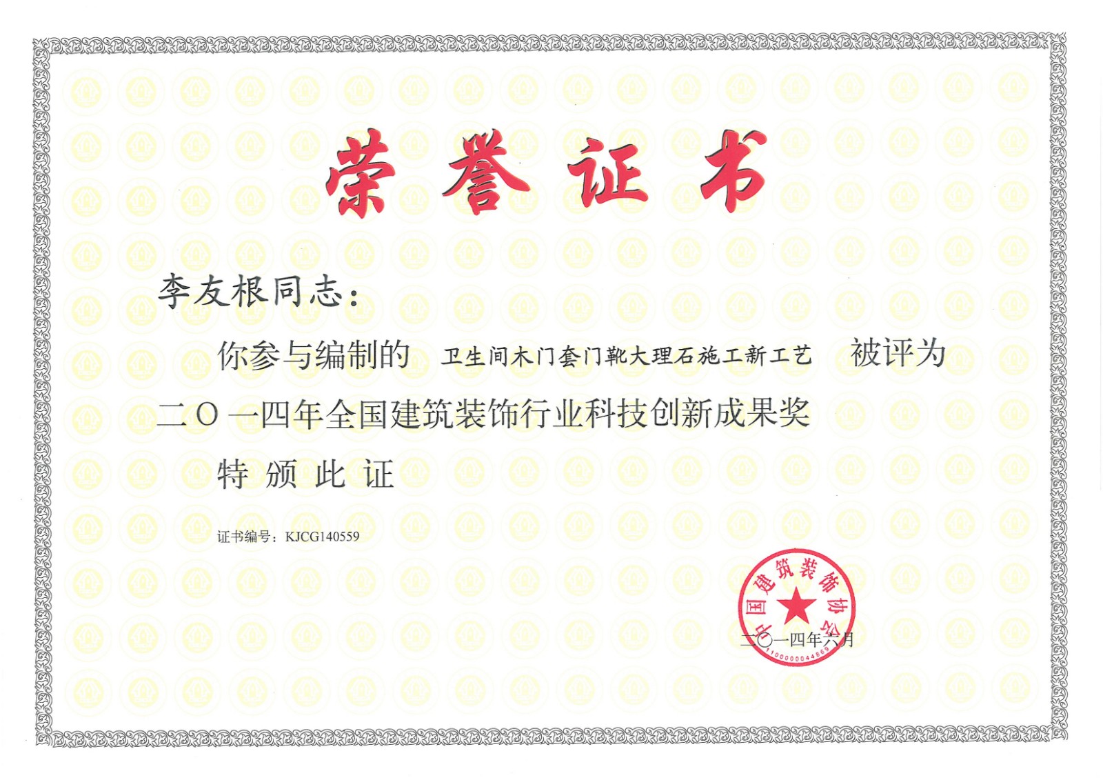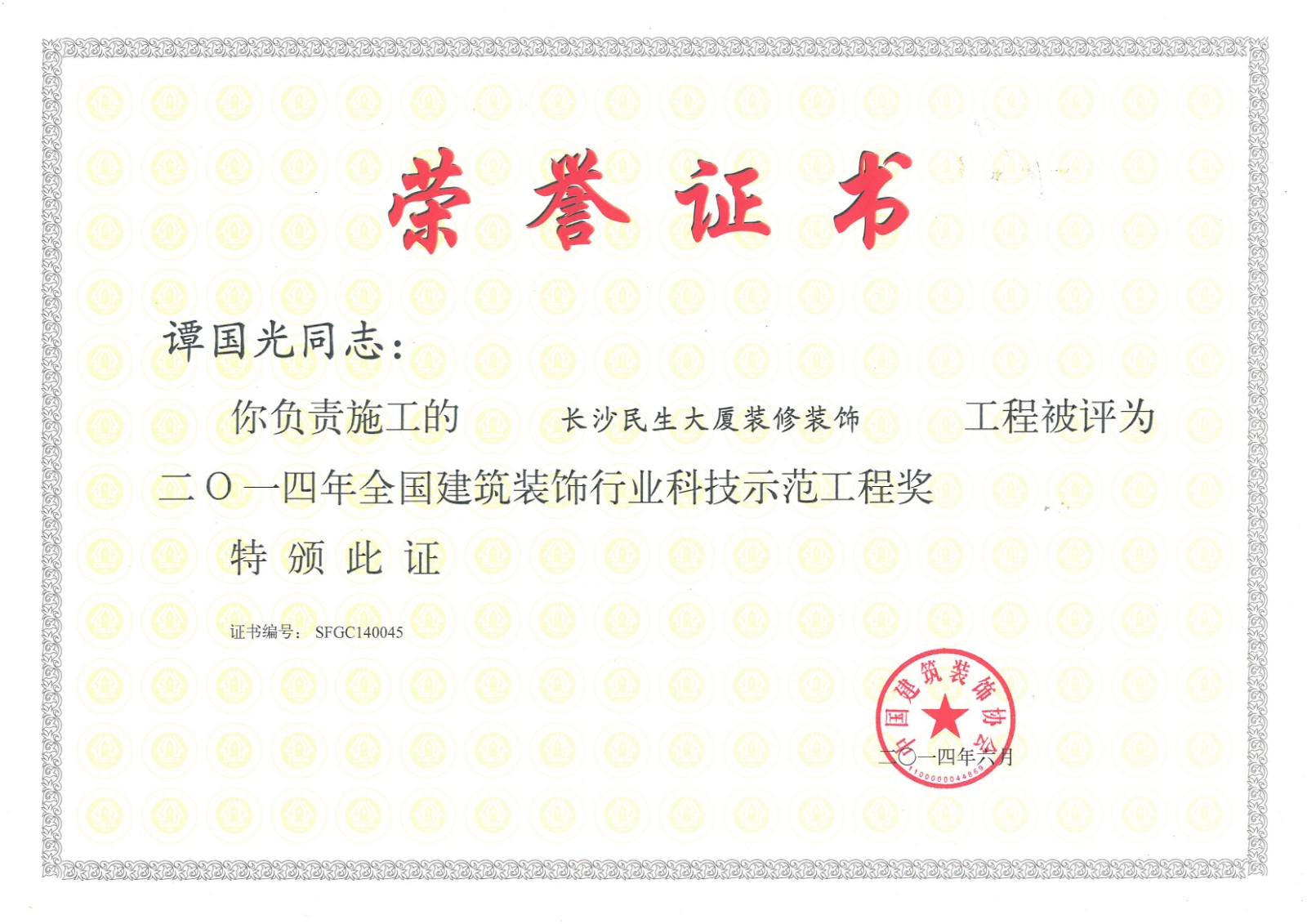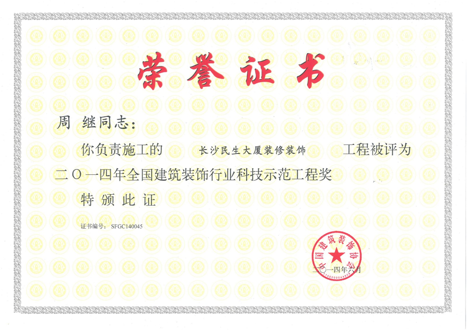 行業(yè)科技示范工程榮譽證書