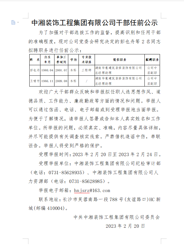 中湘裝飾工程集團(tuán)有限公司干部任前公示(彭也舟、王嘯宇)